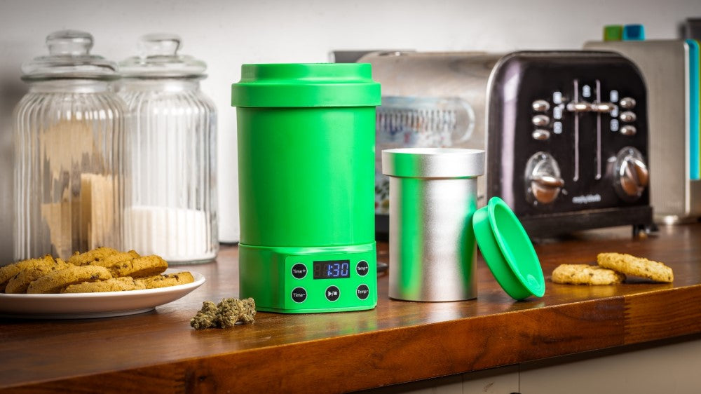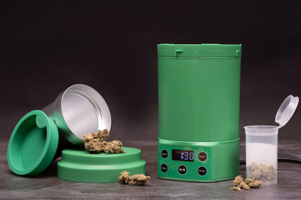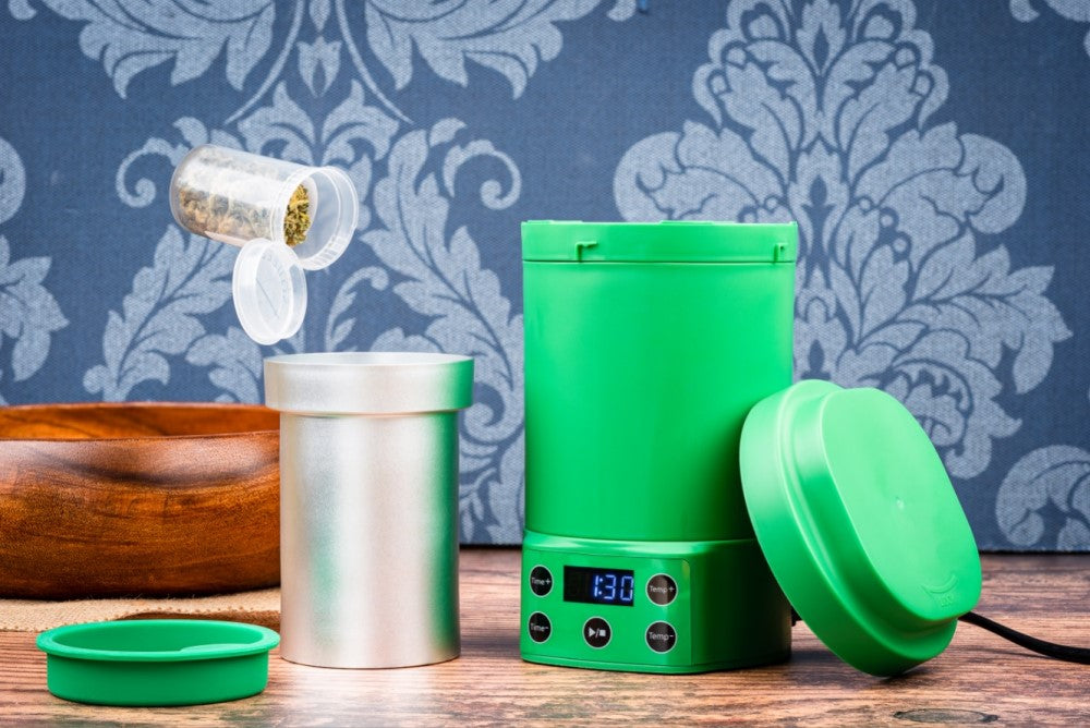 We developed a decarboxylator that is discreet, portable, reliable and easy to use at home that fully activates your material for a much higher potency by providing better control than the fluctuations of an oven which leads to either burning off material or failing to fully activate it.
